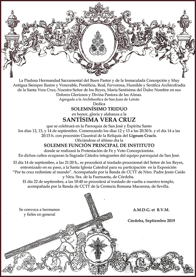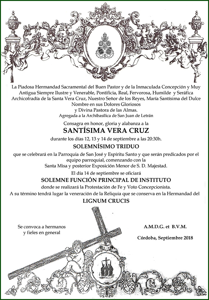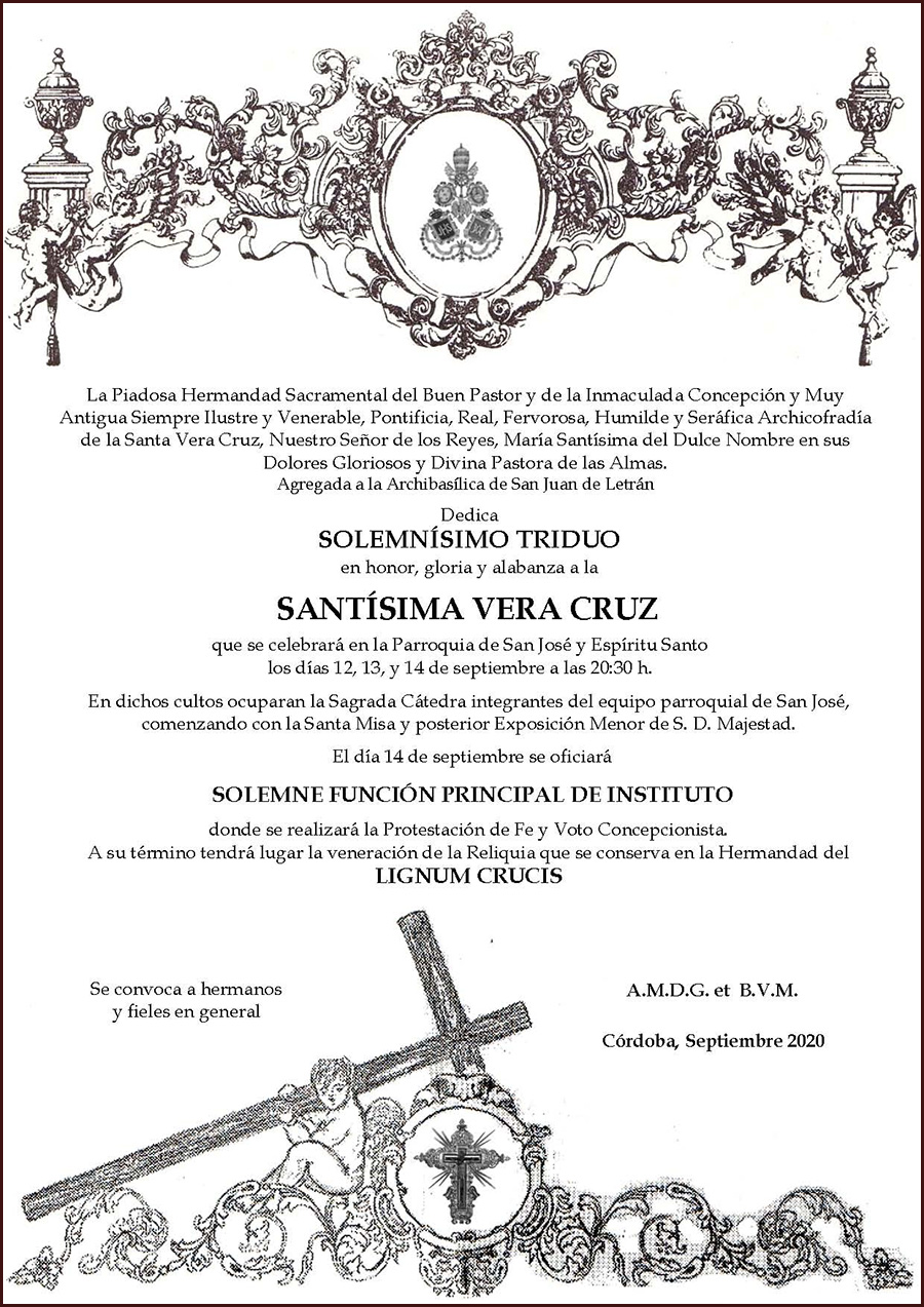 Este domingo, dia 23 de Octubre, celebraremos la Santa Misa en la Santa Iglesia Catedral de Córdoba. Comenzará a las 12 de la mañana y al término será inaugurada oficialmente la Exposición 'Eterna es Su Misericordia: la Vera-Cruz en la Diócesis de Córdoba', en la que como ya hemos informado se podrán contemplar y venerar Imágenes Titulares de las hermandades de la Vera-Cruz de nuestra provincia incluyendo la de nuestra Archicofradía. La Exposición se encuentra ubicada en las naves de la Mezquita-Catedral, en la zona de ampliación de Almanzor. Por lo tanto la entrada a la misma coincide con la entrada de visitantes al monumento. Habrá que acudir a taquilla a retirar una entrada, recordando que para los nacidos o con residencia en Córdoba, es gratuita. La muestra podrá ser visitada hasta el domingo 20 de noviembre.