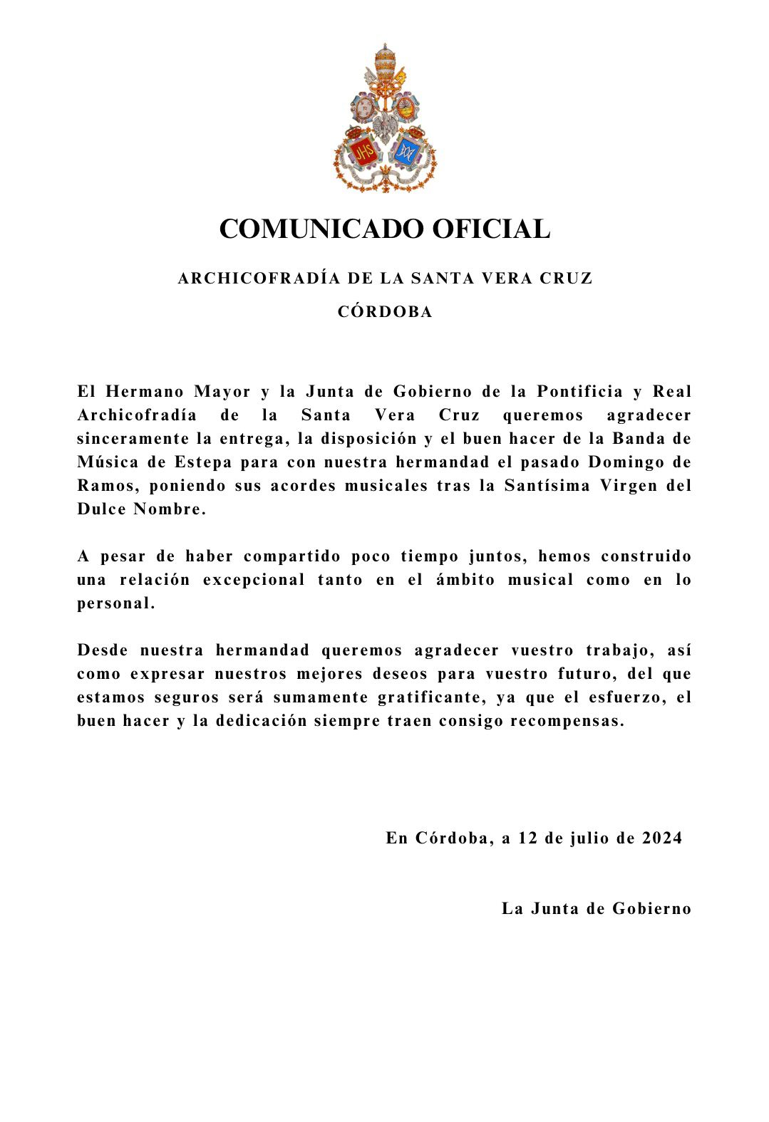 Una vez concluida la exposición, "Eterna es Su Misericordia; la Vera-Cruz en la Diócesis de Córdoba", y con el regusto del trabajo bien hecho, la Junta de Gobierno de la Pontificia y Real Archicofradía de la Santa Vera-Cruz quiere mostrar su agradecimiento por el trabajo y dedicación para que este magno evento fuese una realidad: