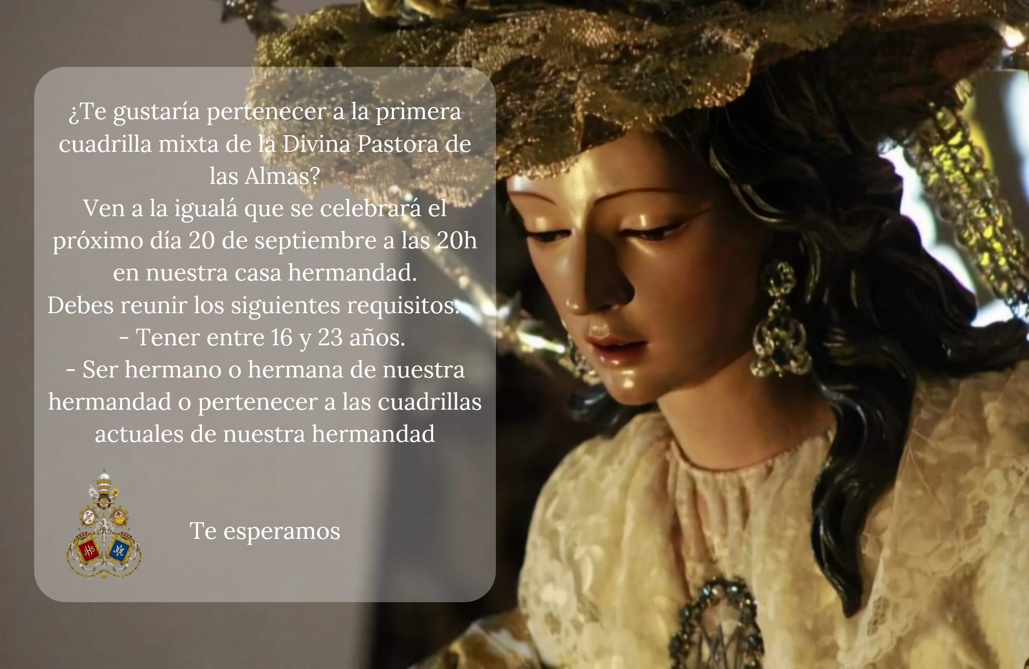 El Grupo Joven de nuestra Archicofradía realiza a lo largo del año distintas actividades tanto en el seno de la Hermandad como de representatividad junto a otros grupos jóvenes en distintas hermandades de nuestra ciudad. Pero si en algún momento cobra mayor sentido es ahora, cuando nuestra Titular de Gloria la Divina Pastora de las Almas nos convoca. Ellos se aglutinan en torno a la Pastora, y realizan una serie de actividades con Ella como referente. Así, estarán los días 12 y 13 de octubre (miércoles y jueves) en el Besamanos a la Divina Pastora recogiendo los litros de leche que los fieles que se acerquen ese día por nuestra Parroquia, depositen a Sus plantas. El fin es dotar de este alimento de primera necesidad a Cáritas parroquial, para que lo distribuya a los más necesitados de nuestro barrio y de las hermandades de nuestra Parroquia.
