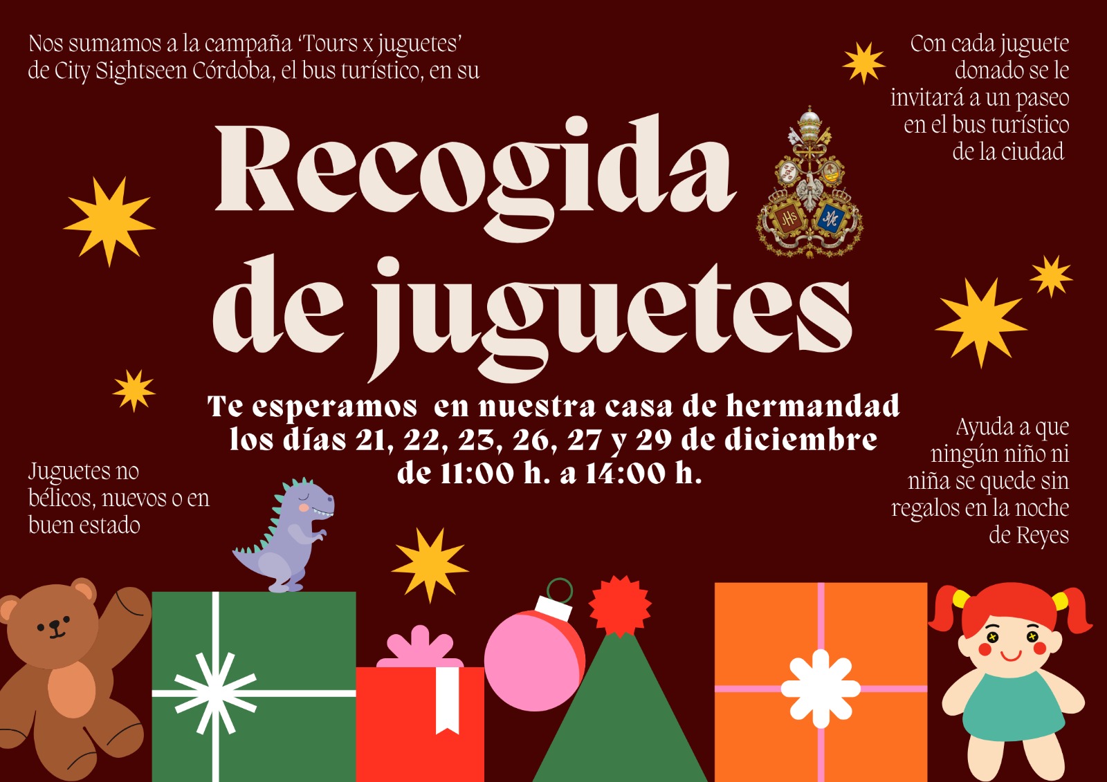 En el día de hoy se ha realizado la entrega a la empresa que gestiona el Bus Turístico de Córdoba de los 268 juguetes recogidos en la campaña que hemos llevado a cabo en nuestra Hdad. Esperamos que, con esta aportación, alegremos la mañana del Día de Reyes a muchos niños.