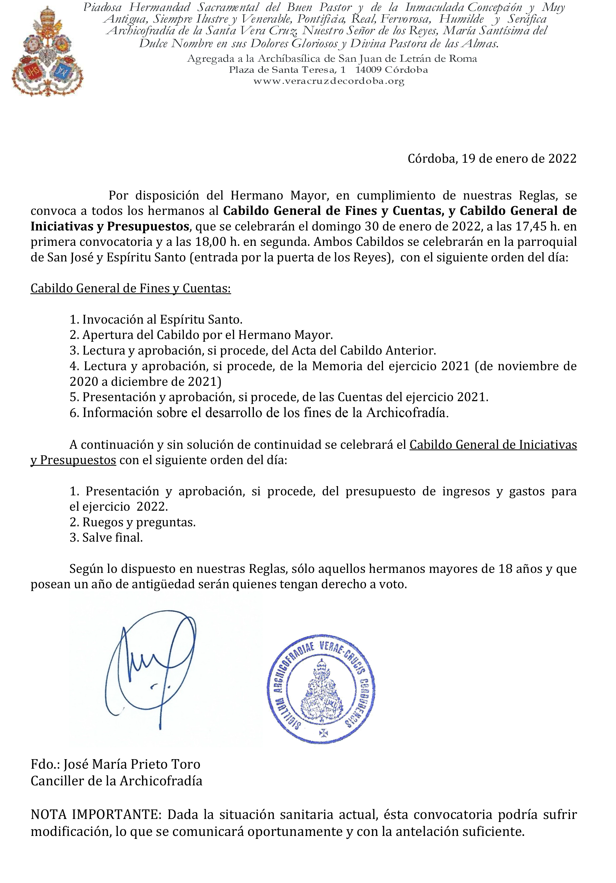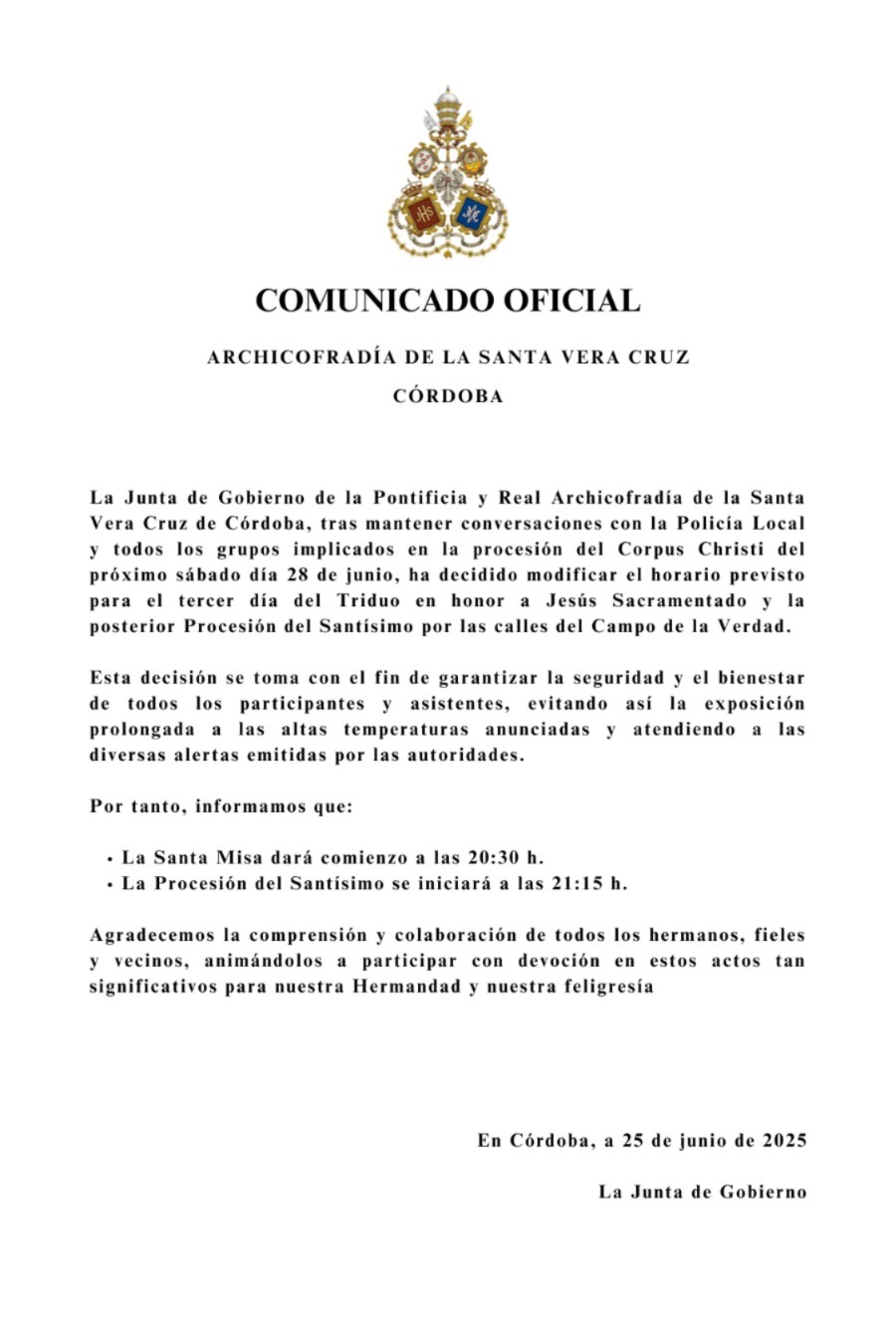 Esta Pontificia y Real Archicofradía, junto al Cabildo de la Santa Iglesia Catedral y la comisión ejecutiva de la Magna Exposición 'Eterna es Su Misericordia: la Vera-Cruz en la Diócesis de Córdoba', que organiza nuestra Archicofradía y en la que participan casi todas las hermandades de la Vera-Cruz de nuestra provincia, convoca a los medios de comunicación a fin de presentar de forma oficial dicho acontecimiento, así como dar a conocer el cartel anunciador del mismo.