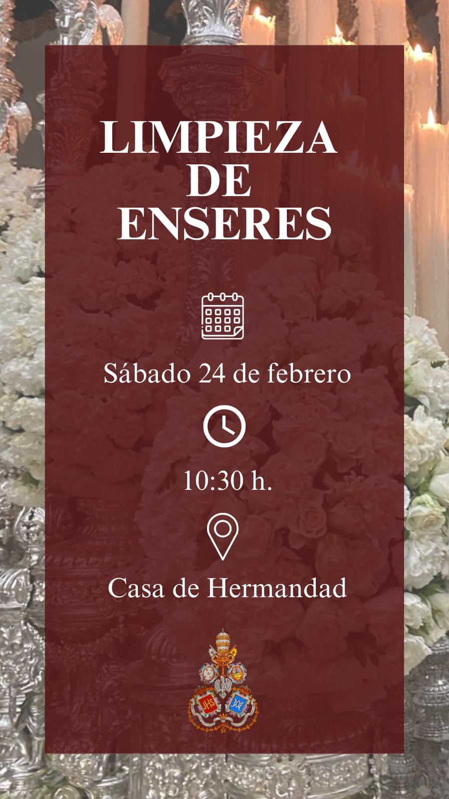 El próximo sábado, día 31 de enero, a partir de las 11:00 h, celebraremos una jornada de limpieza y puesta a punto de los enseres en nuestra Casa de Hermandad, como preparación para el próximo Domingo de Ramos.