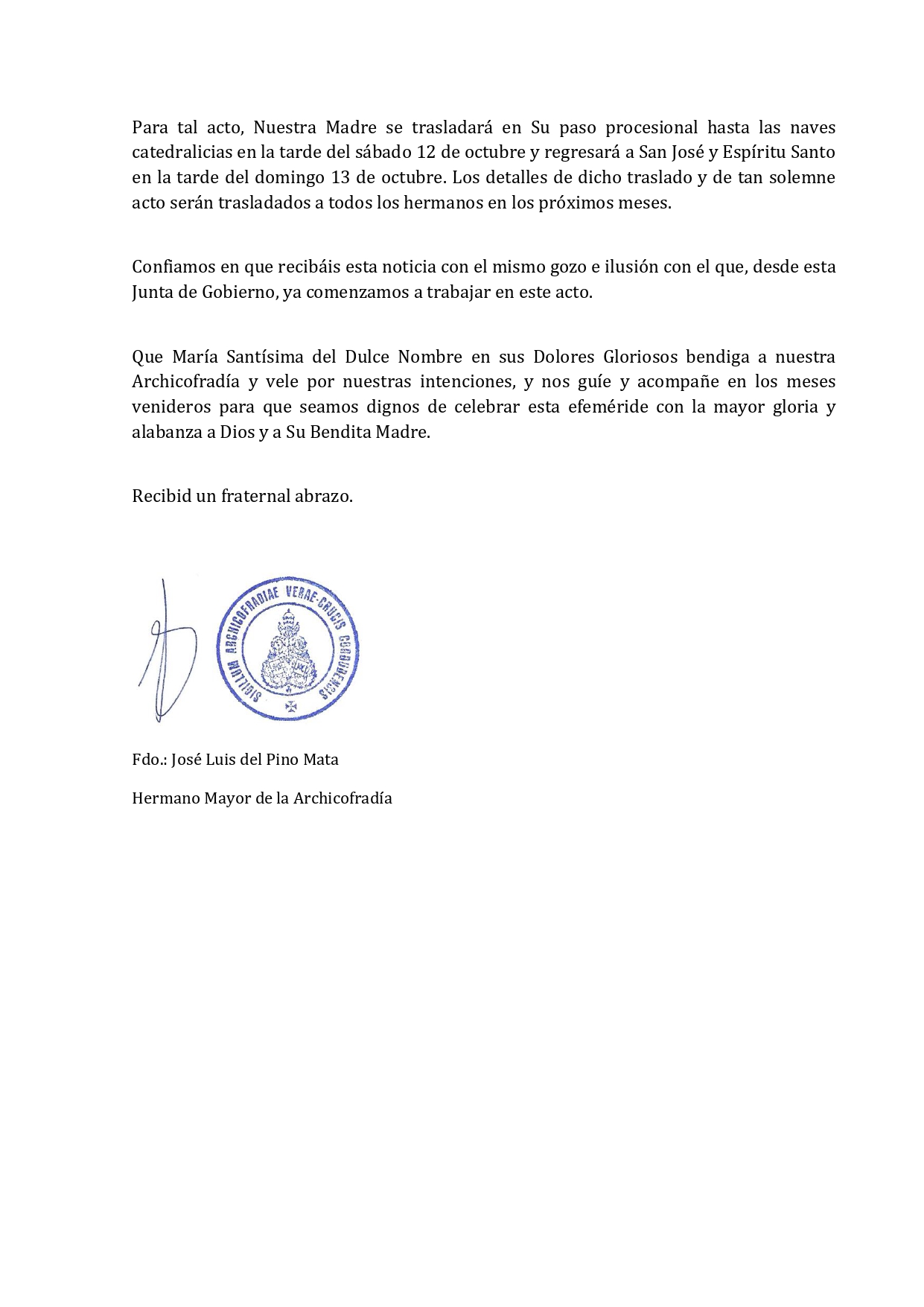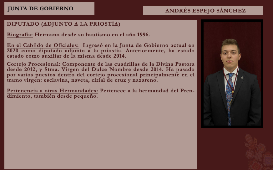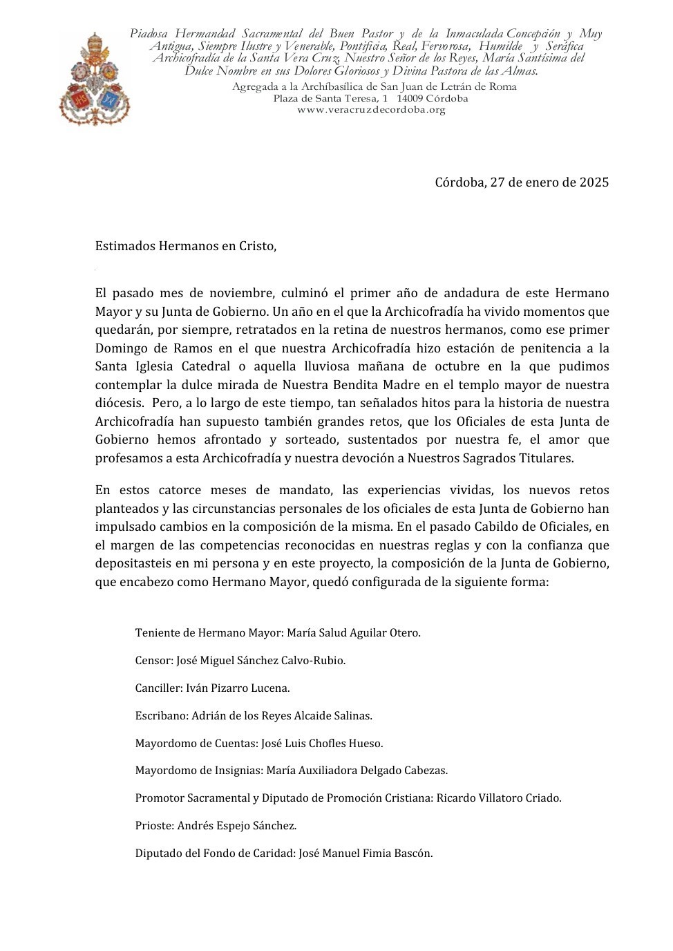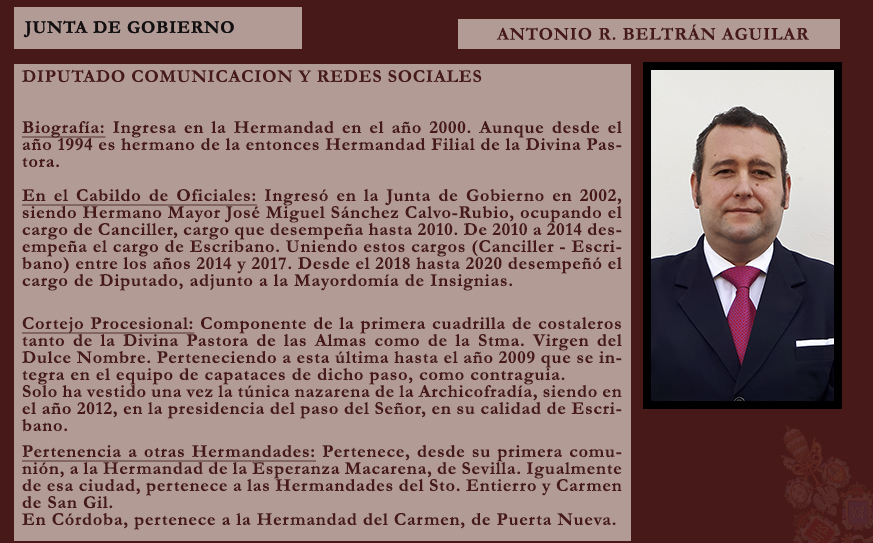 Con este nombramiento, la Archicofradía quiere reconocer su compromiso, entrega y vinculación con nuestra corporación, confiándole una encomienda de gran profundidad espiritual en este tiempo de preparación para la Semana Santa.