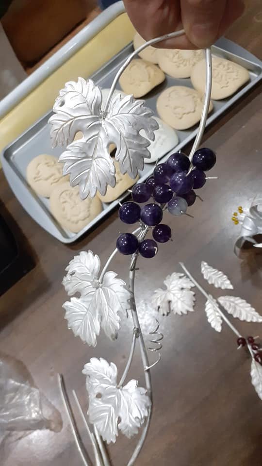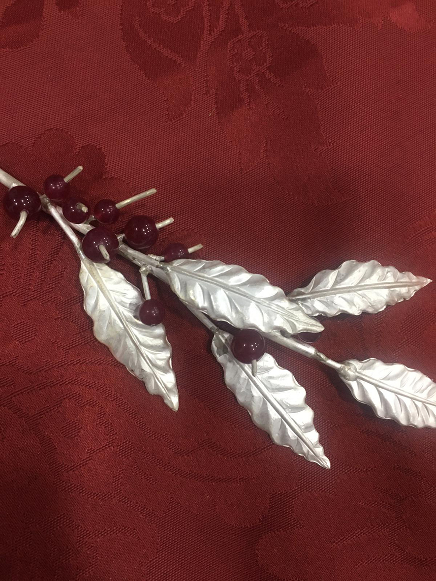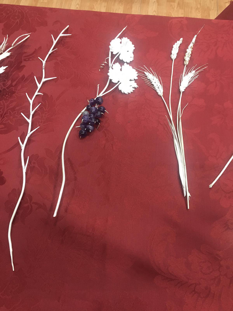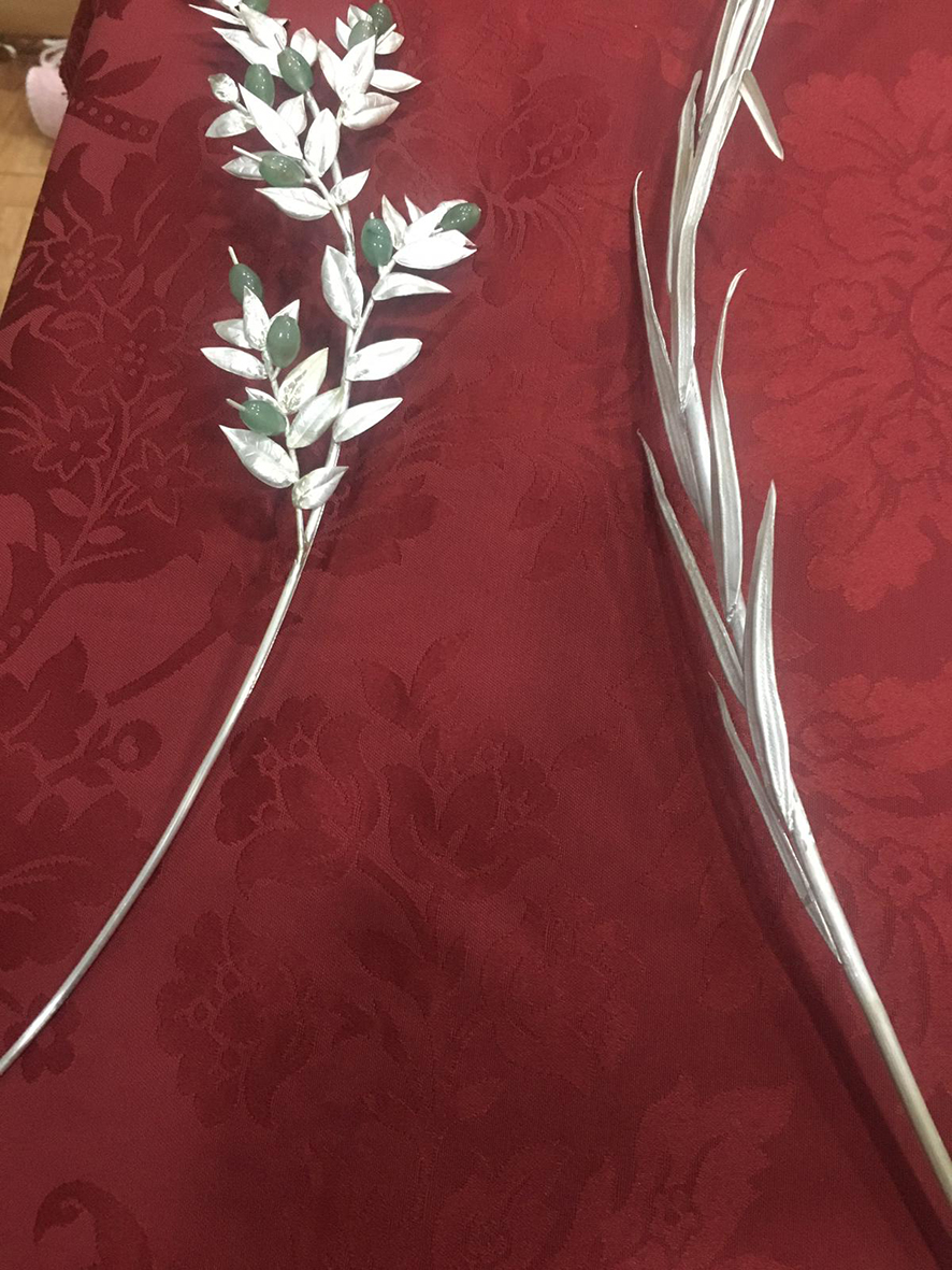 La composición floral que enmarca este conjunto se ha realizado con lentisco natural y lentisco teñido en tonos dorados y rojos, eucalipto burdeos, algodón, hojas de roble en distintas tonalidades, ramas de acebo y limonium de variados colores, creando una armonía cromática que realza el carácter litúrgico y festivo propio de estas fechas.