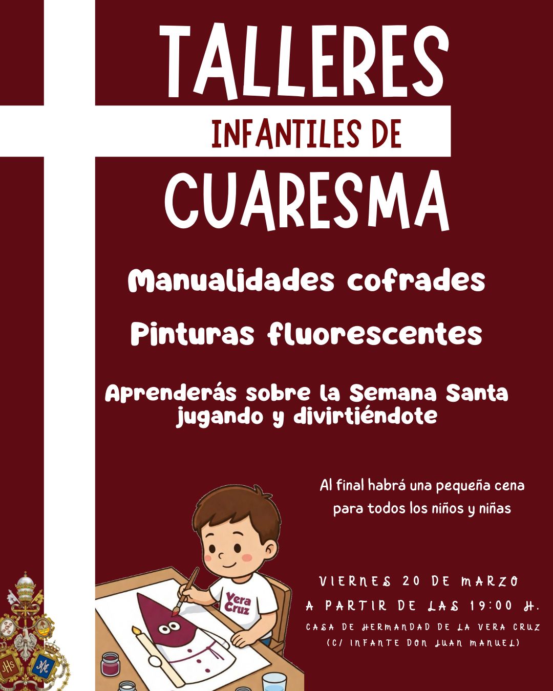 El próximo viernes 20 de marzo, a partir de las 19:00 h, nuestro Grupo Joven nos invita a participar en los Talleres Infantiles Cofrades, una actividad especialmente pensada para los más pequeños.