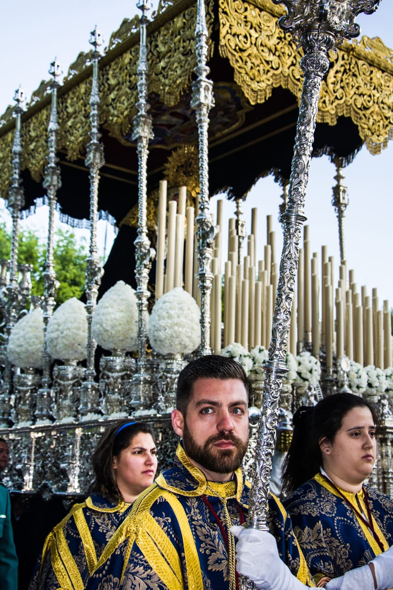Las técnicas empleadas, al igual que en el resto del palio, son las tradicionales del bordado sevillano. Destacan los puntos dobles, la hojilla, la cartulina, los escamados de lentejuelas y una gran variedad de tipos de hilos, sobresaliendo especialmente el uso del oro fino.