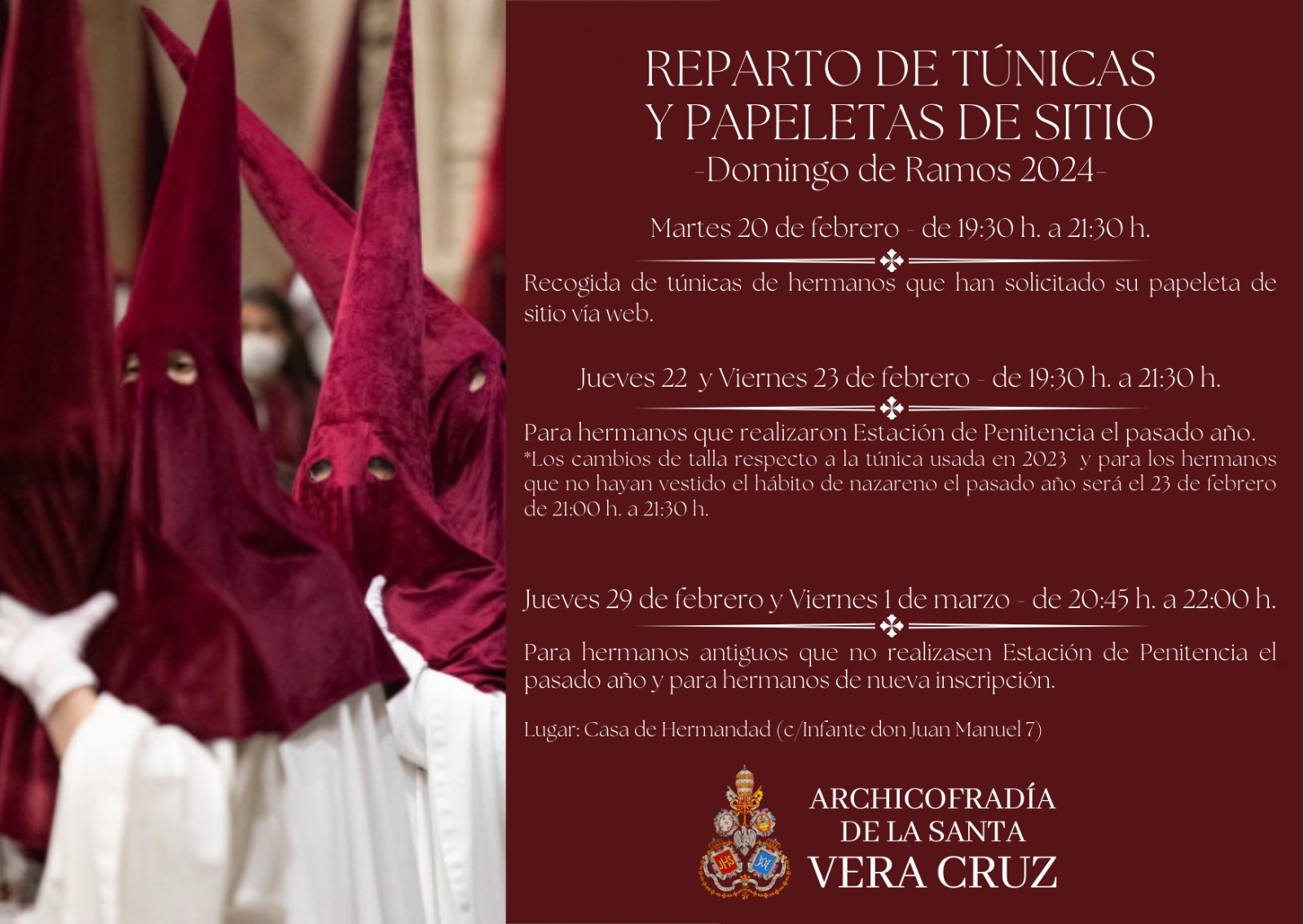 Calendario de los días de reparto de túnicas y papeletas de sitio en nuestra casa de hermandad.Recordamos que puedes solicitar tu papeleta de sitio por la web para agilizar el proceso.