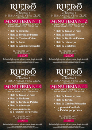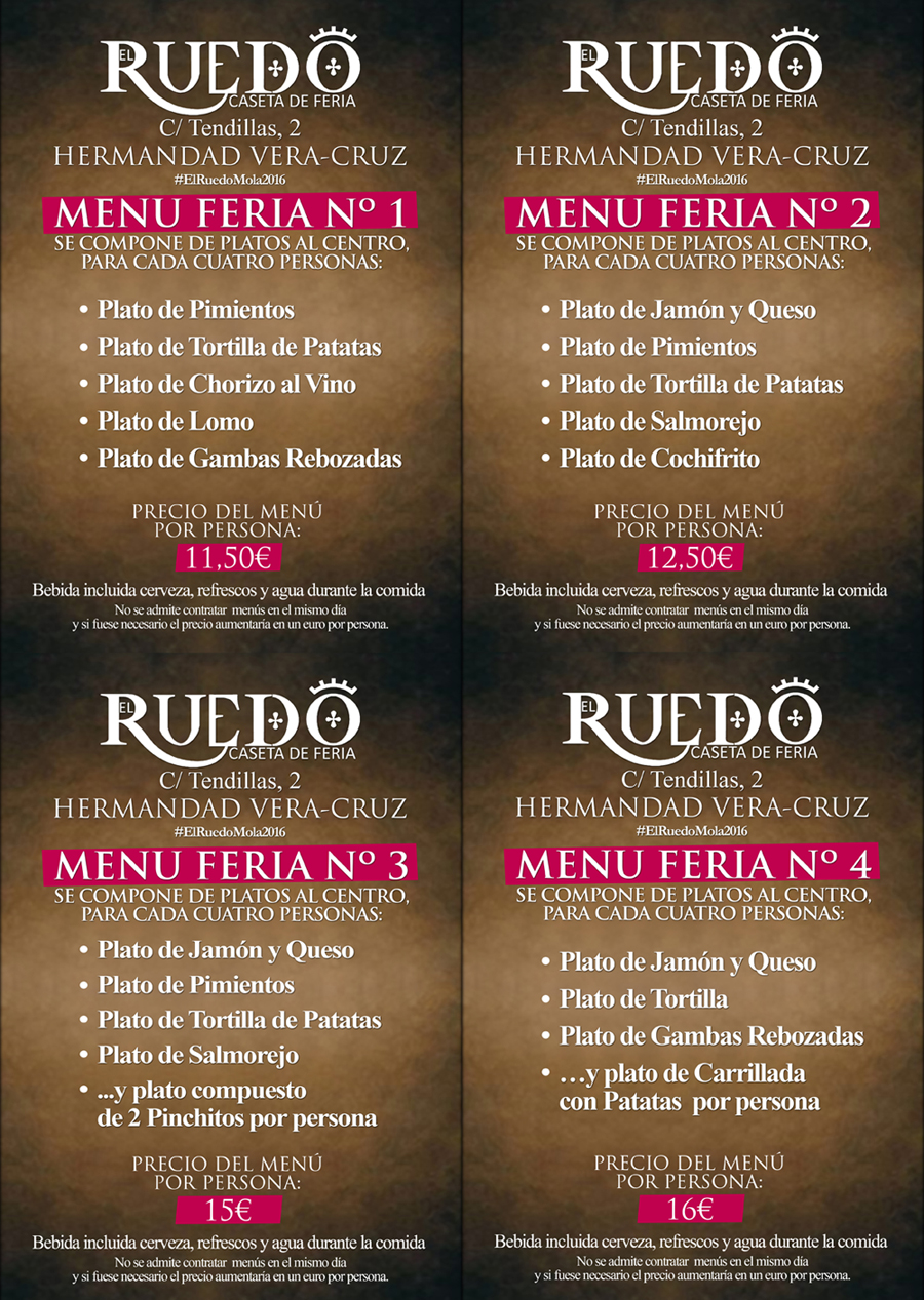 Os mostramos los menús que disponemos, pudiendo hacer la reserva o bien a través de cualquier miembro de la Junta de Gobierno o a través de nuestro email veracruzdecordoba@veracruzdecordoba.org antes del viernes. A partir de ese día se reserva en la misma caseta para garantizar confirmación inmediata.