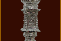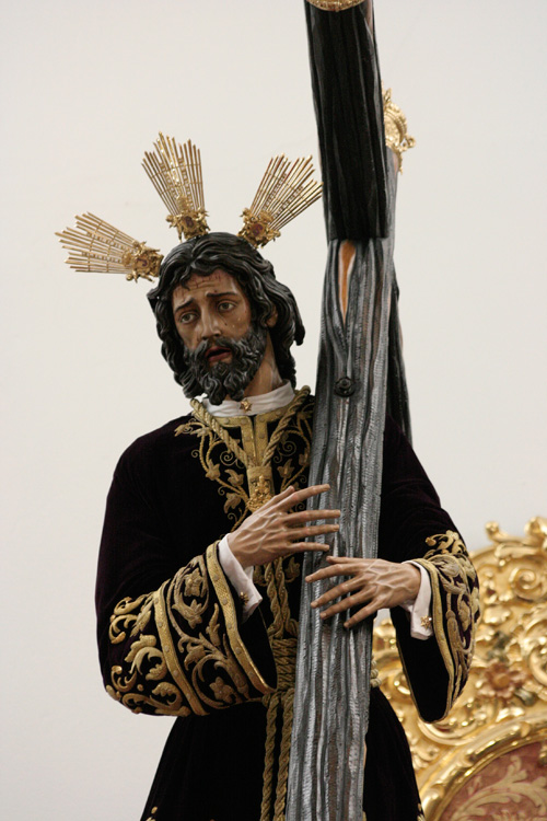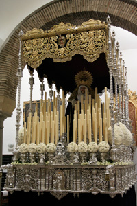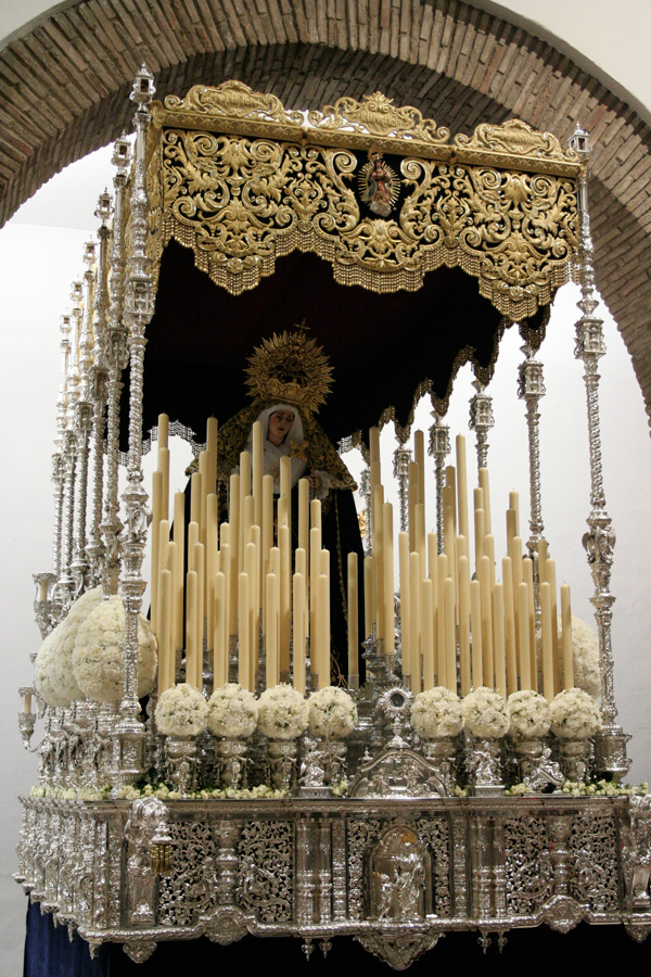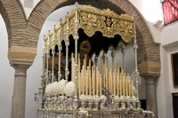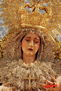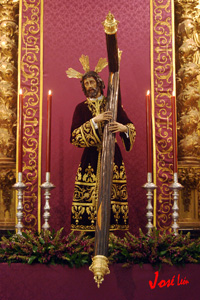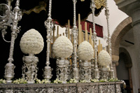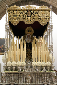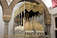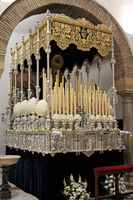 Realizada en el taller de Talla Ornamental Ortíz Jurado de Córdoba. Pieza tallada en madera de cedro real de Brasil, de estilo neobarroco, terminado en oro fino en brillo y mates. Tiene unas medidas de 130 cms de alta (vara aparte) y 70 cms de ancha.