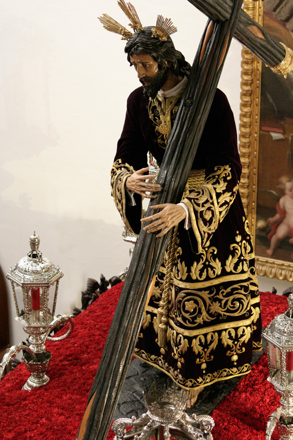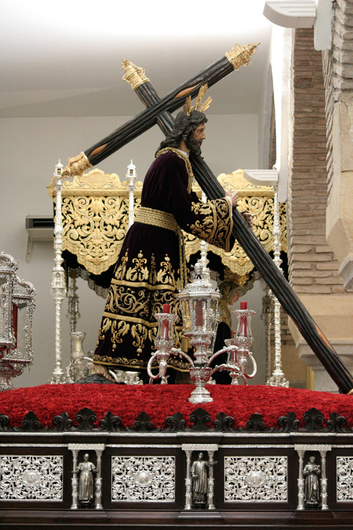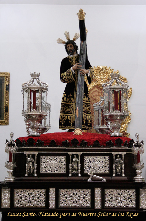 Continuando con el enriquecimiento del paso de Nuestro Señor de los Reyes, estrenamos este Lunes Santo un nuevo juego de faldones realizados en damasco burdeos, terciopelo del mismo color y galón plateado. En una fase posterior se completarán con un juego de broches.