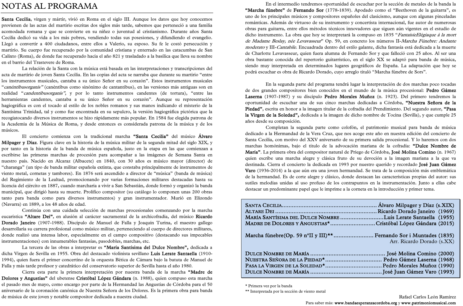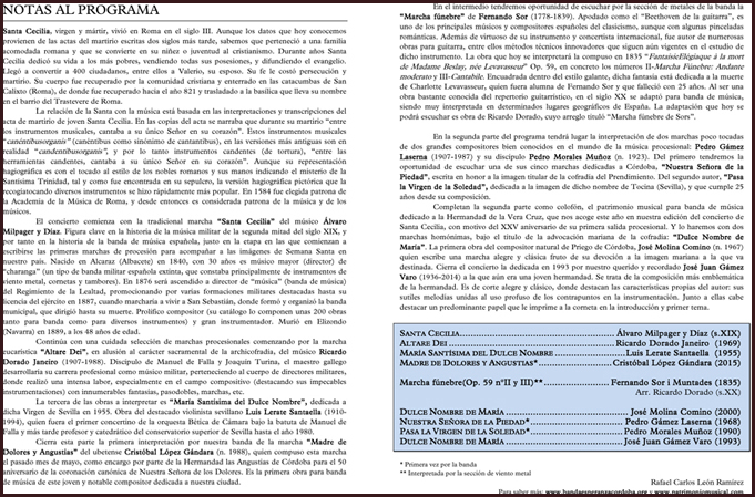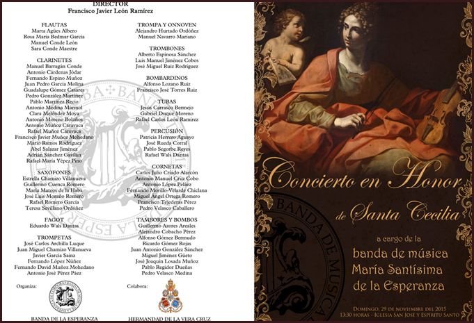 El próximo domingo 29 de noviembre, en nuestra Parroquia a las 13:30 h. y en el marco de la celebración de Santa Cecilia y de la 25ª Estación de Penitencia de nuestra Hermandad, la Banda de Música de María Santísima de la Esperanza celebrará un concierto en base al siguiente programa.