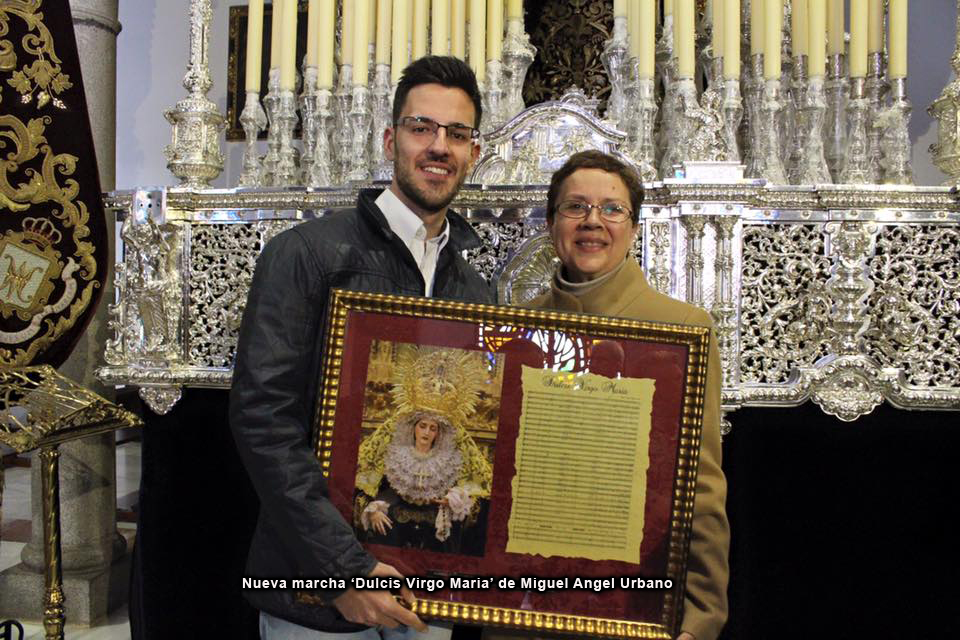 Este Lunes Santo la Archicofradía presentará un gran estreno en su patrimonio musical. Se trata de una marcha dedicada a María Santísima del Dulce Nombre, y ofrecida por el equipo de capataces y costaleros y el actual fiscal de Su paso. El título de la marcha es 'Dulcis Virgo María', y ha sido compuesta por don Miguel Angel Urbano Lasarte.