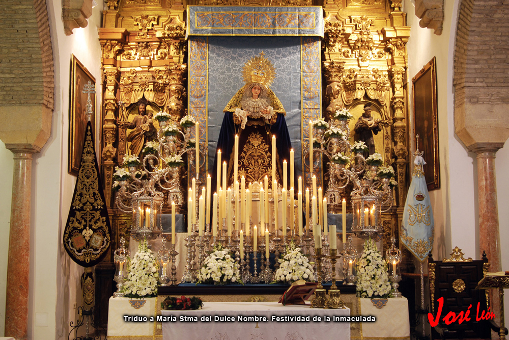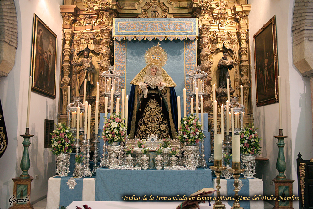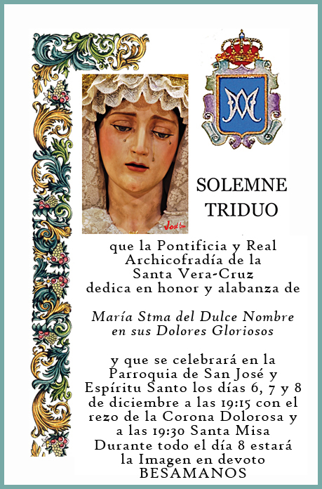 Hoy a las 19:15 horas concluye el Triduo a María Santísima del Dulce Nombre, en la parroquia de San José y Espíritu Santo. Celebramos la festividad de la Inmaculada Concepción, y por dicho motivo durante todo el día Nuestra Bendita Madre se encuentra en Solemne Besamanos. Esta tarde podréis acercaros a sus plantas en horario de 17:30 hasta la finalización del Triduo sobre las 20:30 horas.