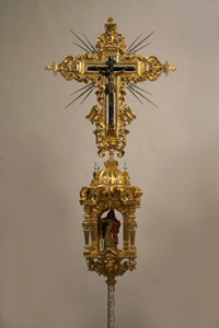 Realiza por el orfebre cordobés Emilio León. Las piezas en orfebrería que forman parte de la Cruz son el asta o vara, los rayos o ráfagas, la cruz de Santa Elena y los remates, todas realizadas en metal plateado.