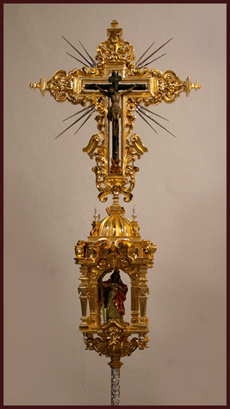 El Cristo de las “Maravillas”, Crucificado de talla completa con cruz arbórea, de 40 cms de largo x 30 de ancho, catalogado en la primera mitad del siglo XVII, según documentos que conserva la familia donante (Álvarez Caparrós), mediante legados y testamentos y atribuido a la escuela o círculo de Martínez Montañés. Santa Elena, imagen contemporánea realizada por el imaginero Edwin González Solís en madera de cedro, policromada al óleo, dorada en oro fino y estofada al temple.